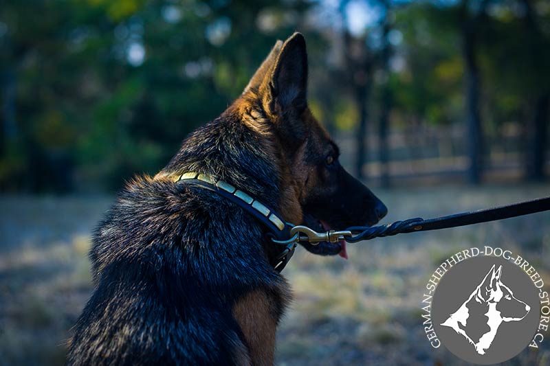 You like shining of metal collars, but to provide utmost comfort for your dog a leather collar is the best variant? The alternative for you is our Decorated Leather Collar with Plates. The basis of this supply is soft leather strap which is adorned with slim brass plates that create golden dotted line along the collar strap. Thus it looks like elegant accessory for walking and training your German-Shepherd.