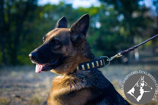 German-Shepherd black leather collar of classy design with handset plates for walking in style