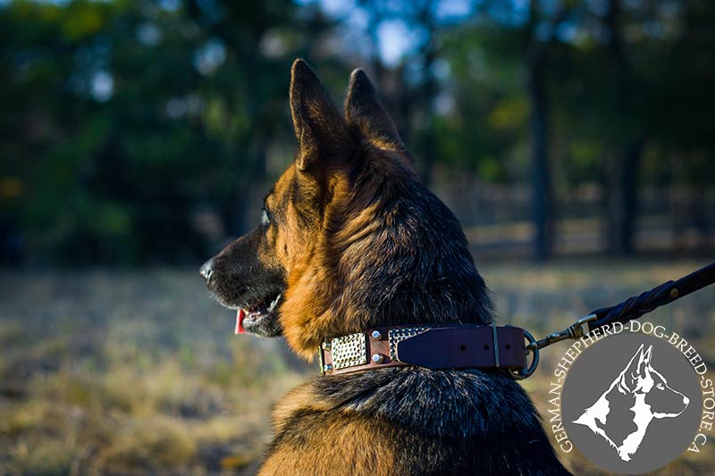 Leather German-Shepherd Collar with Embossed Brass Plates and